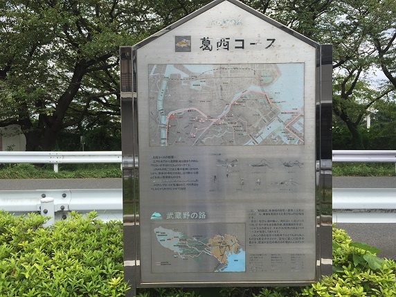 ほどなく、横断歩道を渡って旧江戸川沿いに設けられている「健康の道」に入ります。江戸川区内には幾つかの健康の道が設けられていて、ここから葛西臨海公園までのコースは武蔵野の路と重なっています。江戸川区内の武蔵野の路の案内標識はとても充実していて、道路の分岐点だけでなく、こういった遊歩道への入り口にもちゃんと標識が設けられています。