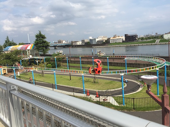 ところどころ傾斜のある遊歩道ですが、車道と完全に分けられていますので、車を気にすることなく安心して歩けます。実際、車道はかなり狭く、しかも大型車の交通量が多いので遊歩道は助かります。対岸の行徳の街並みを眺めながら旧江戸川に沿って遊歩道を歩いて行きますと、新中川との合流点に架かる瑞穂大橋の手前に今井児童交通公園があります。無料で貸し出される自転車やゴーカートがあり、監視員が立つ整備されたコースでは子供たちが楽しんで交通ルールを学んでいます。奧にはレインボーサイクルなるモノレールの軌道が設けられ、親子連れで足漕ぎゴンドラに乗って空中散歩が楽しめます。長さは200m程もあり、高さも結構あるので下手な遊園地の乗り物よりはずっとスリルがあります。乗り物は全て無料というところも凄いですね。