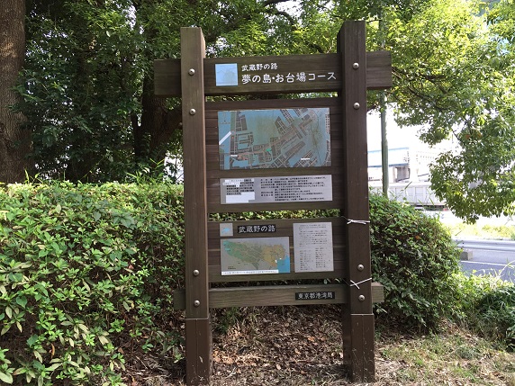 緑道には松の木を始め、いろいろな種類の植樹がされています。遊歩道もよく舗装され、とても歩きやすくなっています。所々に武蔵野の路の誘導標識が立てられていますが、通常は金属製のところ、夢の島コースでは全て山間型の木製です。安上がりになるためか、他のコースと比べて異様に数が多いような気がします。