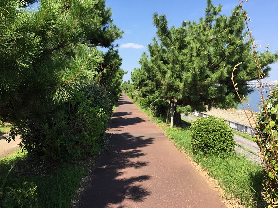 新江東清掃工場の手前から湾岸道路に沿ってお台場まで歩きます。コースは歩道でなく、緑道に設定されています。舗装されていない区間もありますが、森の中を歩いているようです。