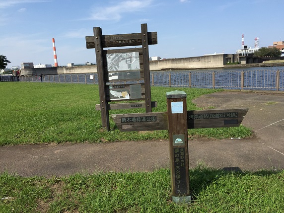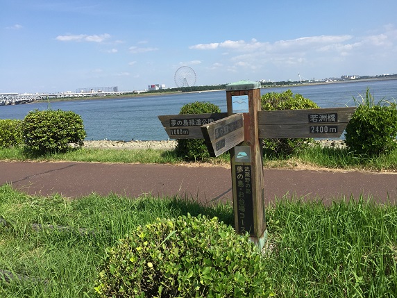 湾岸道路とか京葉線が通る高架下を抜けて、夢の島緑道公園に入ります。ここは東京ゴミ戦争の舞台となったところですが、夢の島という呼称は皮肉を込めて名づけられたのではなく、終戦後に遊園地が計画されていたことに由来するということなのだそうです。夢の島コースは、お台場までは湾岸道路に沿って歩くのですが、高架下を抜けた先だけは三角形をなぞるようにコースが設定されています。そこに、案内板と誘導標識が並んで立っていました。案内板をよく見ますと、コースの説明文の一部に白いテープが貼られ、内容が書き換えられています。武蔵野の路は、今から20年以上前に制定され、その後維持管理はされていないと思っていたのですが、このコースだけは管理されているようです。起点が変更になった理由は書きましたが、終点が城南島から青海客船ターミナルに変わったのは、当初見込んでいた城南島への海上バスの運行が無くなったからからでしょう。距離が短くなったのは、海上区間の距離を除いたためと思われます。