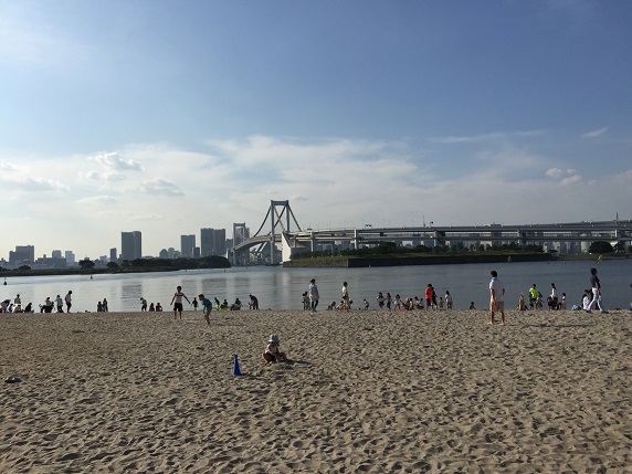 湾岸道路を起点にしている明治通り、三つ目通り、晴海通りをを過ぎ、有明コロシアムの先で新都橋を渡ります。有明橋西交差点を右折し、お台場海浜公園駅の横を通って、お台場海浜公園の砂浜に出ます。人工の浜辺には砂が敷き詰められ、海水浴場のような雰囲気を醸し出しています。この日は何かの催しが行われていたようで、多くの家族連れで砂場は一杯でした。