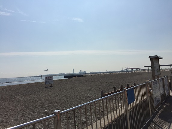 城南島は羽田空港の対岸に位置し、C滑走路が真正面に見えます。距離にしたら1kmもないかもしれません。東南側の人工浜辺からは、巨大なジェット機が離陸の滑走を始めた瞬間から、急角度で上昇し、脚を収納する様子が轟音と共に迫力満点で見られます。