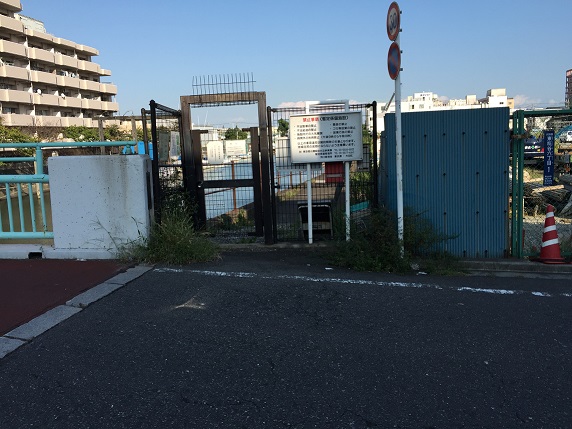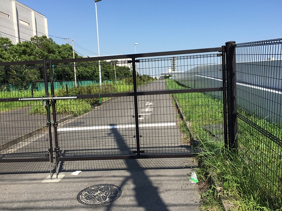 日酒販の建物の隣に、堀をめぐらしたような東京港臨海道路の海底トンネルの出口が見えます。その横には、換気所方向に真っ直ぐに伸びた道路が見えますが、入り口はフェンスで閉じられていて、通行は出来ません。推測ですが、コース制定当初は波止場に設ける計画だった海上バスの乗り場からこの道を真っ直ぐに進むようになっていたのかもしれません。