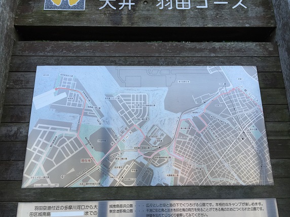 注記:()内は、今回の案内板で削除されていました。確かに、城南島には海上バスが発着できる桟橋は見当たりません。武蔵野の路が開設された当時は海上バス運行の計画があったのでしょうか?