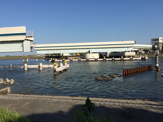 森ケ崎公園というか、水再生センターの先に巨大な橋脚が2本並んで立っています。まるで工事途中の橋のようですが、羽田可動橋といって、橋が旋回して合体し、首都高羽田線の渋滞緩和のための迂回路として一時期使われたのだそうです。将来再稼働することもあり得るとのことで、現在もそのままの形で残されています。映画の撮影にも使えそうな光景ですね。