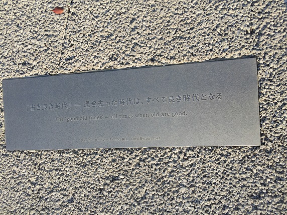 環状八号線に出て、羽田旭町交差点で左折します。10年前に歩いた時は、この交差点から穴森橋手前までは荏原製作所の広大な敷地でした。現在は敷地は「クロネコヤマト」のヤマト運輸に売却され、一大物流拠点としての羽田クロノゲートになっています。建物の外観は非常に近未来的な形状で、とても物流の施設とは思えません。環八通りに面した前庭は「和の里パーク」として地域貢献ゾーンになっていて、逆円錐形の建物にはレストランや展示施設などが入居しています。また、前庭の歩道には格言を記した何枚ものプレートが埋め込まれ、それぞれがナルホドと納得いく文言になっています。一例を挙げますと、(詩人バイロンの言葉)「古き良き時代」−過ぎ去った時代は全て良き時代になる。The 'good old times' - all times when old are good.