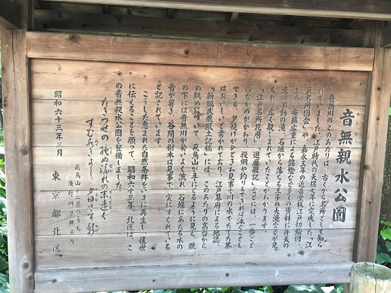 音無川のこのあたりは、古くから名所として知られていました。江戸時代の天保7年に完成した「江戸名所図会」や、嘉永5年の近吾堂板江戸切絵図、また、安藤広重による錦絵など多くの資料に弁天の滝、不動の滝、石堰から落ちる王子の大滝などが見られ、広く親しまれていたことがわかります。「江戸名所花暦」、「游歴雑記」などには、一歩ごとにながめがかわり、投網や釣りもできれば泳ぐこともできる、夕焼けがひときわ見事で川の水でたてた茶はおいしいと書かれており、江戸幕府による地誌、「新編武蔵風土記稿」には、このあたりの高台からの眺めについて、飛鳥山が手にとるように見え、眼の下には音無川が勢いよく流れ、石堰にあたる水の音が響き、谷間の樹木は見事で、実にすぐれていると記されています。こうした恵まれた自然条件をいまに再生し、後世に伝えることを願って、昭和63年、北区は、この音無親水公園を整備しました。