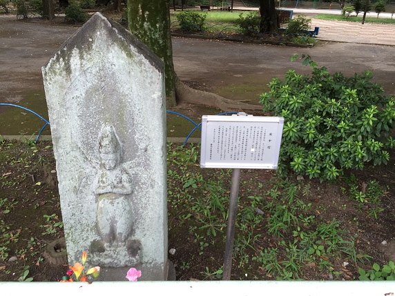 石神井川は大山街道と交差する箇所が多いようで、ところどころに大山道の道しるべとなったであろう庚申塔が立っています。中央大学グラウンド跡地に整備された練馬総合運動場の近くに新大橋が架かっていますが、この辺りには江戸時代に埼玉道から分岐し、富士大山道に至る旧道(田中道)が通っていたそうです。これらの庚申塔や不動明王座像も大山詣での旅人の道標となったのでしょう。