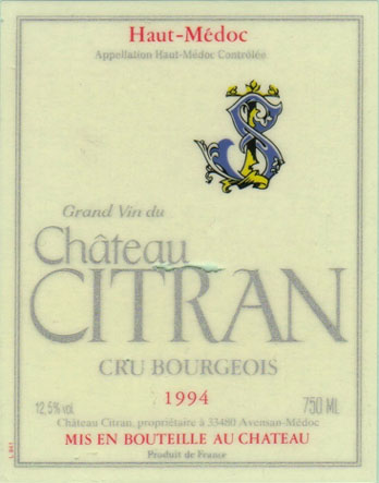- (赤) フランス: CHATEAU CITRAN CRU BOURGEOIS HAUT-MEDOC (1994)