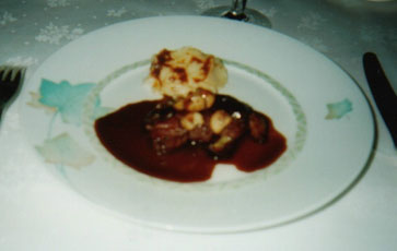 et aux champignons sautes, puree de pommes et de celeri-rave,