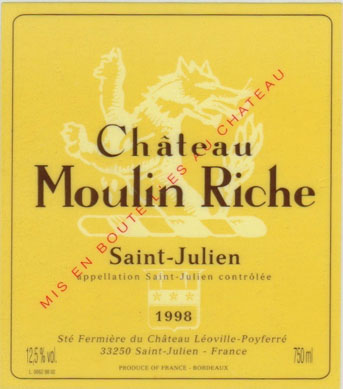 - 『シャトー・ムーラン・リッシェ』は、ボルドー地方メドック地区サンジュリアン村の産で、シャトー・レオヴィル・ポワフェレのセカンド・ラベルのワインです。シャトーのオーナーより、シャトーの蔵から直接出庫されたことを証明する認定書が付されています。