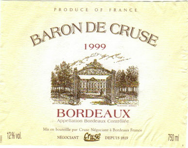 - (赤) フランス: BARON DE CRUSE BORDEAUX (1999)