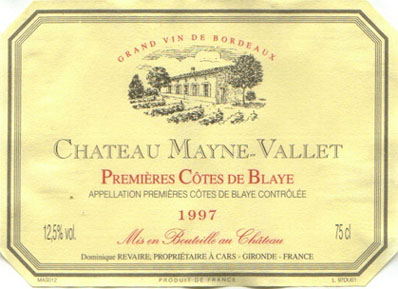 - (赤) フランス: CHATEAU MAYNE VALLET PREMIERES COTES DE BLAYE (1997)