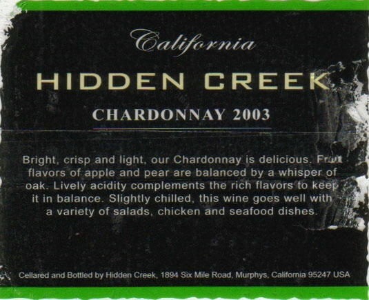 - (白) カリフォルニア: HIDDEN CREEK CHARDONNAY (2003)