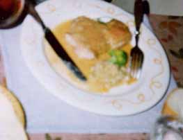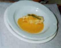 さて、最初は前菜です。丁度、会席料理のように皿に何種類かのおつまみが並べられています。ま、お腹も空いているし全員一斉にパクツキ出しました。ふと横を見ますとカメラが。。。あっ、写真を撮り損ねました。2品目は海老のムースです。フランス旅行中は近接写真が皆ピンボケだったので、今度は慎重にパチリ。。。ちなみに、この海老のムースはなかなかの味でした。相当に手が込んでいるのでしょう。丁度シャルドネが空っぽになってしまいましたね。