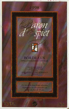 - (赤) フランス: BARON D'ESPIET ROUGE BORDEAUX (1998)