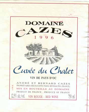 - (赤) フランス: DOMAINE CAZES CUVEE DU CHALET ROUGE (1996)