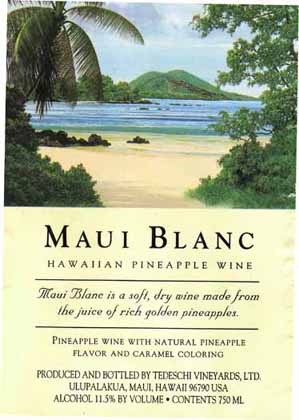 - Maui Blanc is a wine made from the juice of fresh golden pineapples. Fermentation of the rich golden juice takes place in temperature controlled vats and is stopped at near dryness. The result is a soft, dry, fruity, wine with an unmistakable pineapple bouquet. Serve chilled. Label art by Curtis Wilson Cost. Produced and Bottled by Tedeschi Vineyards, Ltd. Ulupalakua, Maui, Hawaii