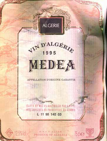 - 『メデア』は、地中海に臨むマグレブの大地に自然の恵みを欲しいままに、フランスの技術で築き育てられたアルジェリア葡萄栽培公社(O.N.C.V.)のワインです。手作りの健康的な原産地呼称保証ワイン(A.O.G.)です。中重口で、肉料理、油料理、チーズなどに相性が良く、”通”向きの逸品のワインです。室温が高い時は多少冷やして召し上がって頂くと一層美味です。主な葡萄品種は、カリニャン、サンソオ、グルナッシュ、カベルネ・ソービニョン、シラー、その他です。