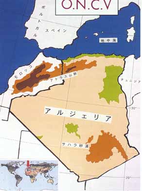 ワインは、地中海を囲る歴史の中に多く語られ、セム族、アリアン族、エジプト、アラブ、ギリシャ、ローマと古くから培われ脈々と受け継がれてきました。アルジェリアでは今なお多くの保存されているローマ時代の遺跡が示すように葡萄栽培技術もローマ人、ベル・ベル人等を通じ、さらに近代ではフランスの技術を受け継ぎ、独立後は独自の品質を改良してきました。地中海、北アフリカのマグレブ(陽の沈む処)では、雨量が葡萄の収穫を左右し、雨量の少ない年は不作といわれ、また南からの熱風『シロッコ』も葡萄を焦がしてしまいます。葡萄栽培は地中海沿岸に限られ、オラン、アルジェ、東海岸地方(コンスタンティヌス)の平野部、丘陵部、山間部で行われ、栽培面積も独立後は食糧増産の線に沿って多少減少したものの昨今は回復しつつあります。生産量の殆どが赤で、白は僅か10%程度です。『高品質限定ワイン(V.D.Q.S.)』、あるいは『原産地呼称保証ワイン(A.O.G.)』は軽く円やかで、酸味が殆どなく、概してアルコール度が高く、高品質なので多くの人に好まれています。また、低農薬です。とはいえ、アルジェリアでは大半がイスラムで、その生産量の90%は、ヨーロッパ、カナダ、アメリカ等に輸出されています。独立後、1968年に『葡萄栽培公社(O.N.C.V.)』が設立され、葡萄栽培や品質管理ワインの輸出に当たっています。