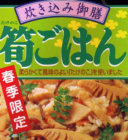 - 五目ご飯は年中出ていますが、松茸ご飯や筍ご飯はやはり季節の中で味わいたいものです。この筍ご飯の具袋にはたっぷりの柔らかい筍が入っており、季節感が味わえてとても美味しいです。