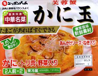 - カニ玉は最近どこのスーパーでも売っています。とても手軽に作れますけど、誰が作っても一流のコックさんの味になります。今回はこれに、無謀にも生食用フカヒレを入れましょう!生のフカヒレは初めて見ましたが、金ピカでとても食べる気はしません。玉子をボールに割りいれ、カニ玉の袋に入っている蟹肉とパウダーを入れて軽く混ぜます。これにフカヒレをどばーーーっと入れて良くかき混ぜます。これを油を引いた熱したフライパンに空けて手早くかき混ぜます。半熟になる位が適当です。出来上がったら直ぐに大皿に盛って、アツアツのうちに頂きましょう。