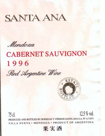 - (赤) アルゼンチン: SANTA ANA CABERNET SAUVIGNON (1996)