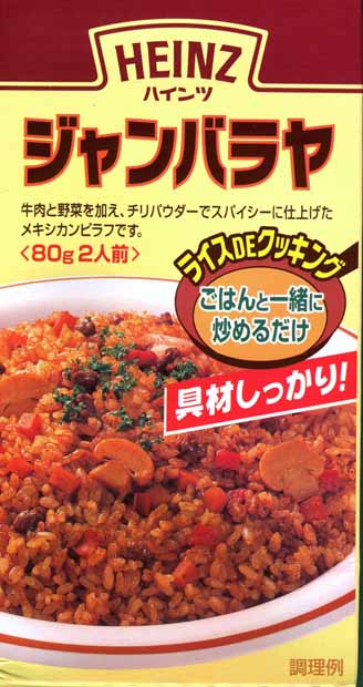 ジャンバラヤも本格的に作るとなかなか難しいものでしょうが、最近はルー一発で簡単に作ることができます。まず、フライパンにバターをたっぷり溶かします。大きな塊を入れる位を想像して下さい。マーガリンやサラダオイルではダメです。バターが少し溶けたら、冷やご飯をお茶碗軽く3杯分位入れて手早く炒めます。焦げ付かないように少し火を弱くした方がいいでしょう。ある程度ご飯があたたまったら、そこにハインツの『ジャンバラヤ』を袋から絞り出して混ぜ込みます。柔らかなルー状になっていますので、ご飯と混ぜ合わせるのは簡単です。調味料は一切必要ありません。全てこのルーがカバーしてくれます。むしろ、胡椒とか塩のような単純な味の調味料は加えない方がいいのです。ルーに封じ込められたケイジャンの複雑で深い味わいのスパイスが全てを作り上げてくれます。ご飯が焦げない程度に焼きあがったらサア出来上がりです。おや、バターが多すぎたかな?と思う位がベストです。ちょっとピリ辛ながら、日本では絶対感じることの出来ない異次元の味がテンプラニーリョ・ワインの味を最高に引き立たせるでしょう!