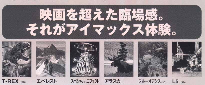 週末に新宿駅南口の高島屋タイムズ・スクエア12階にあるアイマックスに行ってきました。アイマックスは以前にもご紹介しましたが、私の大好きな3D映画館です。丁度6月5日から始まった『アイマックス映画フェスティバル』の初日にあたり、いろんなジャンルの6本の映画が交代で上映されていてラッキーでした(6本立てではありません)。アイマックスはご存知だと思いますが、アメリカでよく見かける3次元立体映画の劇場です。なにしろ、スクリーンの大きさが、高さ18m・幅25mもあります。更にフィルムの大きさも通常の35ミリ映画の10倍、70ミリ映画に比べても3倍もあります(面積比)。つまり、スクリーンが大きいだけでなく、映像がとても鮮明で緻密なのです。それに加えて音響設備が素晴らしく、6チャンネルのデジタル・サウンドは凄い迫力を生み出します。オープンしてからそんなに日が経っていないので、内部はとてもきれいだし、席の配置もゆったりしています。客席はかなりな急勾配になっていますので、前の席に座高の高い人が座っていても頭が気になることもありません。大体が1本40分前後で、しかも完全入れ替え制ですから観客の回転は速く、従って満員で入場待ちということも滅多にありません。ただ、シアターの端っこに座ると映像・音響が立体感に欠けますので早めに入って中央のいい席を確保しましょう。