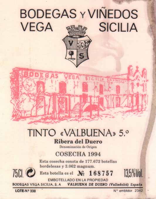 - (赤) スペイン: BODEGAS Y VINEDOS VEGA SICILIA TINTO VALBUENA 5 (1994)