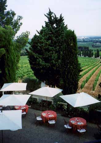 窓を開けますと、これがまた絶景!見渡す限り一面の葡萄畑が広がっていて、遥か彼方の地平線で青空に吸い込まれていきます。久しく見なかった青い空と緑の大地です。心も体も芯からリラックスします。ふと、窓の下を見ますと幾つかのテーブルが準備されていて、真夏の陽を遮るようにパラソルが広げられています。未だディナーには早いようですが、そろそろテーブル・セッティングを始めているようです。今日は早めに宿が確保できたので、最初は『地球の歩き方』に紹介されていた村の中心にあるという『La Mere Germaine』というレストランに行こうと思っていました。ですが、こんな素晴らしい景色を見ながらのお庭でのディナーもいいなと思ってホテルで頂くことにしました。