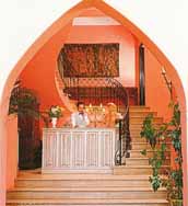 石段を上って2階に行きます。7−8部屋がありますが、どうもそれ以外に部屋が見当たりません。まるでゲストハウスのようなものです。案内された部屋に入りますと、これがまた映画に出てくるような豪華な調度品の数々。。。思わずタメ息がでます。昔の建物ですからシャワーなどはちょっと手狭なのですが、もうそんなことはどうでもよくなります。