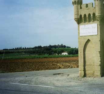アッという間に住宅地を抜けると、簡易舗装のような道が広大な葡萄畑の中を真っ直ぐに通っています。道の両側は見渡す限り青々とした葡萄畑です。たまにワイナリーでしょうか、ワイン販売の農家の家が見えます。ちょっと心は引かれたもののそのまま車を走らせます。数分も走ったでしょうか、真っ直ぐな道の正面に小高く盛り上がった丘があり、そのてっぺんに廃虚のようなお城の跡が見えます。あれ?右手の方にも小高い丘が見えてきました。丘の上にはお城が見えます。直感的にあれがそのホテルではないかと思い、行ってみることにします。道に面して巨大な石の門があります。そこから遥か離れた丘のてっぺんまで小道が続いているのです。