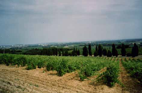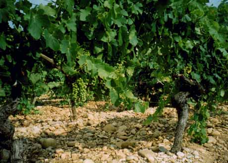 葡萄畑は肥沃な土壌を想像していたのですが、現実は全く違いますね。よくよく畑を見ますと、地面はまるで石ころだらけです。その石ころの間から葡萄の木が伸びている訳です。よく茂った葡萄の木の葉っぱをかき分けますと、未だ青い小さな房ですが鈴なりに葡萄をつけています。感動しますね。せっかくですからどんな味なのか葡萄を一個食べてみましょう。ガリッ。。。未だ青い葡萄の実は、酸っぱくて青梅のようです。これが有名なパプゥのワインになるのかァ。。。と感動また感動です。