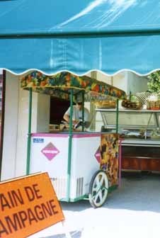 何回も車を停めて谷底を見ているうちにちょっと飽きてきました。先を急ぎましょう。グランドキャニオンを降りて行きますと、段々と道は平坦になってきます。そのうちにT字形に道が交わりました。右に進むとカンヌ、左に進むとグルノーブルか何処かに行きます。車は右に折れてカンヌを目指します。。。と、と、ナポレオン街道に入った途端に、農家の露店でしょうか、道端にテント張りの売店があります。ツ・ツ・ツーーーと通り過ぎたのですが、どうも気になってまた引き返します。露店とはいっても、結構な品物が並べられています。ワインは勿論、パンやチーズ、パテに生ハムにソーセージ。。。等々、ワイン好きな方にはとても魅力的な品々です。おっと、アイスクリームもありましたぁ。。。