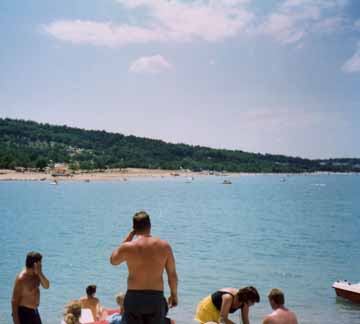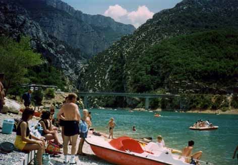 さて、山道ではあっても、きれいに舗装された道路をノロノロと登っていきます。後から後から車が追い抜いていきます。そんなことはあまり気にしないで、外の景色を眺めながら更に山を登っていきますと、急に眼下に大きな湖が見えてきました。それにしても大きいですねぇ。。。まるで海のようです。このあたりがグランドキャニオンの入り口でしょうか?ちょっと湖まで降りてみましょう。日本は四方を海で囲まれていますので、海水浴場には不自由しません。それに湖の水温は一般に夏のシーズンでもかなり冷たいのであまり湖で泳ぐことはしませんが、さすがに南仏のこと、この陽射しでは水温もかなり上がっているようです。湖には甲羅干しをする若い女性や、元気よく泳いでいる子供たち、それに足漕ぎボートを楽しむ家族連れなど、こんな人里離れた場所にありながら結構賑やかです。