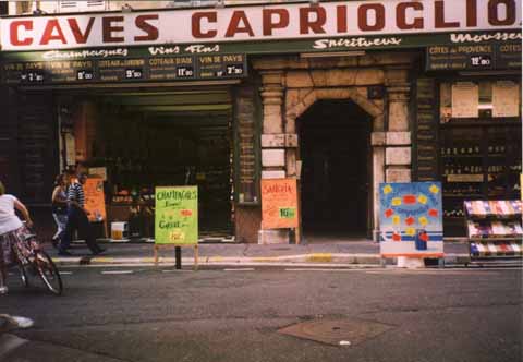 朝になりました。ニースの朝市を見に行きましょう!旧市街は昨夜行ったのでスイスイと歩けます。でも、最初にお魚市に行こうとしたら道に迷ってしまいました。ぐるぐる歩いているうちに、酒屋さんがみつかりました。なかなか立派な酒屋さんですねぇ。ちょっと寄ってみましょう。お店の中はワインで一杯です。結構安いワインが並んでいます。カウンターの後ろには巨大なタンクが何個も並んでいて、ここで量り売りをしているようです。またしても、1リットル当たり8フランです。