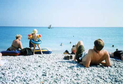 とりあえず、早いうちに車を返却しようとフロントの方にレンタカー会社の場所を聞いたら何とホテルの裏手にあるとのこと。もう街中の運転はしたくないと思っていたので、これは天の助けです。HISさん、ありがとう!面白いことにレンタカーの返却場所は営業所ではなく、共同駐車場なのです。何処に停めたかを紙に書いて渡せばいいのです。手続きしている間に、隣のグルメそうなおばさんにニースのお勧めのレストランを教えてもらいます。結構気さくな方で、地図に場所を書き込みながらプロヴァンス料理の名店を教えてくれました。今夜はそこで南仏の旅を打ち上げましょう!ホテルに戻る前に『プロムナード・デ・ザングレ』を散歩します。海岸線は至る所海水浴場です。老若男女、沢山の海水浴のお客さんがいます。カンヌと違って沖合いには大きな船は停泊していません。何処までも続く青い海と青い空が地平線の彼方で交わっています。