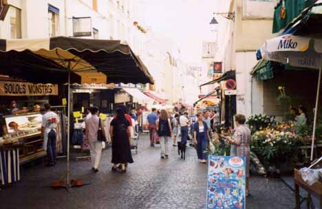 最初は、7号線の『Censier Daubenton』という駅の近くにある朝市に行きます。駅から出てもそれらしき朝市の光景は見られません。地図を頼りに歩いていましたらちょっとした裏通りに賑やかな商店街がありました。朝市というと、ニースのようなテント張りの露店を想像していたのですが、ここは普通の商店街です。最近日本でもはやりのスーパーの朝市のようです。お花や野菜といった定番の品でなく、普通のお店が時間を早めて売り出しているような感じなので何でも揃います。特に、お魚・ハム・チーズがお買い得ですね。通りには朝のお買い物を楽しむパリっ子達で一杯です。