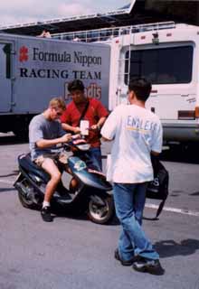 フォーミュラ・ニッポンでは、お昼休み時間を利用してピットウォークが行われます。優待入場券を持っている人はピットが立ち並ぶ通路に入ることができるのです。本番直前のマシンの様子も見れますが、大体は未だ車輪を外した状態です。整備が遅れている車はカバーも外され、エンジンがむき出しのままになっているのもあります。有名ドライバーもピットの中に立ち、サインにも応じてくれます。でも一番人だかりのしているのは『サーキット・クイーン』と呼ばれるお嬢さん達のいるあたりのようです。カメラの放列にもにこやかにポーズをとってくれますが、お仕事とはいえなかなか大変ですね。ピットウォークの間に、招待のゲストと抽選で選ばれた2人の観客は2シーター・フォーミュラに乗って体験走行が出来ます。今回のゲストは大友康平さんでした。ドライバーと同じレーシング服を着用し、ヘルメットを被って後部席に乗り込みます。2シーターといっても本物のレーシングカーですから凄い迫力です。凄まじい火花を撒き散らしながら目と鼻の先を通り抜けるのですから乗っている人は迫力満点でしょう。