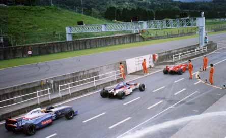 さあ、いよいよ公式予選がスタートです。時折小雨のぱらつく生憎の空模様ですが、コースの路面はそれほど悪いコンディションではなさそうです。コース脇の入り口からフォーミュラ・カーが一台づつコースに飛び出していきます。耳をつんざく爆音が富士山麓に響きわたります。あまりにスピードが出ているので、目で車を追いかけるのもままなりません。何でも直線コースでは300km近くのスピードが出ているとか。。。