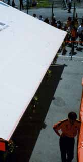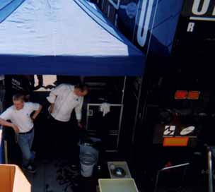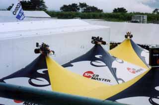 今回のフォーミュラ・ニッポン第7戦には13チームが参加しました。どのチームも超大型のトレーラーをピットに横付けしています。車の中には、何種類ものタイヤや整備工具が溢れています。そのトレラーの横には大型のテントが張られていて、さながらベースキャンプのようです。デコレーションにもなかなか凝っていて、屋根の先端に自チームの格好をしたおもちゃの車を飾ったり(ムーンクラフト・チーム)、庇にお花を飾ったり(ARTA:AUTOBACS RACING TEAM AGURI)となかなかに見せますねぇ。