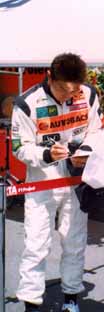 決勝の日になりました。今日はお天気も良く絶好のレース日和ですね。でも夏の名残というか、ギラギラと太陽が照りつけて真夏以上に暑い!レースの前はドライバーの方々もリラックスしてサインなどにも気楽に応じてくれます。外人ドライバーなどはまだラフな服装ですが、日本人のドライバーは律義にレース服を着込んでいます。さぞかし暑いことでしょう。なにせ防火服を兼ねているのですから気密性が高く、サウナに入っているようなものです。