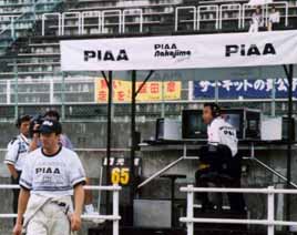 特別の入場券を持っている人はピットの2階にある部屋からレースを見ることができます。エアコンが効いて快適な上に、昼食と飲み物つきです。昼食はお弁当ですが、駅弁よりは遥かにランクが上の本格的な内容です。飲み物もフォーミュラ・ニッポン特製のウーロン茶です。おや、あそこに『HOUND DOG』の大友さんが。。。
