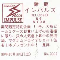 何しろ東京から徹夜で車を運転してそのままレース観戦をやったものでもうクタクタです。今回はラッキーなことにサーキットから車で10分程の白子駅近くのホテルグリーンパーク鈴鹿という真新しいホテルに泊まることができました。普通ならこのあたりのホテルはレース関係者用に押さえてあって、一般の観戦者はなかなか泊まれません。で、ホテルに行く前に例によって酒屋さんを探します。丁度、途中にお酒のディスカウント店が見つかりました。ビールや日本酒に混じってワインも結構置いてあります。予選でシューマッハが勝ったので今日はドイツの赤、それも珍しいスパークリングにしましょう。