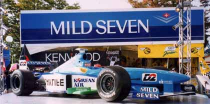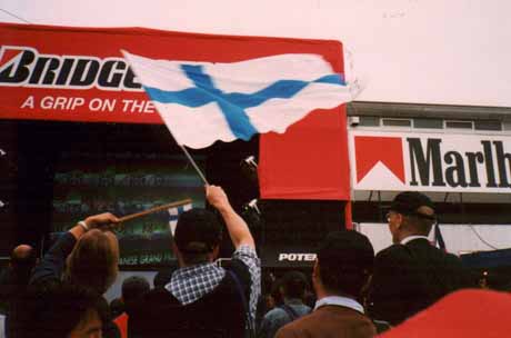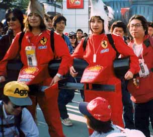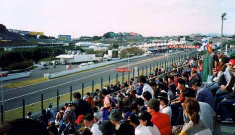 その後もミカ・ハッキネンの独壇場。。。2位以下をどんどん引き離して圧勝です。今回のレースの結果により、ミカ・ハッキネンとエディ・アーバインのどちらかが本年度のチャンピオンに決定することになっていたので、両者の激突が見ものだったのですが勝負は最初からついていたようです。ミカ・ハッキネンは日本に到着してからレースに集中するため全ての歓迎行事をキャンセルして集中力を高めたそうです。やはりこういったレースでは、マシンの調子よりも気力の差が大きな要素を占めるようです。モナコ・グランプリでは、ミカ・ハッキネンが王宮のレセプションでシャンパンを傾けている間にシューマッハがイタリアでスタートダッシュの練習に励んでいたのと対照的ですね。さて決勝レースの勝敗がつきますと後は一目散に駐車場へダッシュです。表彰式の様子も途中のモニター・スクリーンで眺めるだけです。ちょっとでも遅れると地獄の渋滞に巻き込まれます。