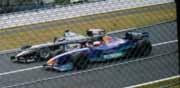 B’zのギタリストの松本孝弘さんによるシンセサティックな君が代の演奏に引き続いていよいよ決勝レースのスタートです!予選でポールポジションをとったシューマッハが断然有利か。。。と思われていたのですが、あにはからんやミカ・ハッキネンが猛烈なスタート・ダッシュをかけて飛び出してきました。第一コーナーにさしかかる前にもう勝敗は歴然としています。