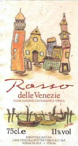 - イタリアは水の都『ヴェネツィア』を州都にもつヴェネト州、その産地の葡萄(メルローとカベルネ)で造られた『ロッソ デッレ ヴェネツィエ (ボッター社)』は、中辛口で飲み易いタイプの赤ワインです。少し冷やしてパスタやお肉料理とお召し上がり下さい。(ラベル/イラスト:佐藤礼恵さん)