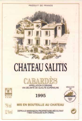 - Le Cabardes est une region de transition et d'harmonie a la croisee des suds, entre la douceur atlant que et la volence mediterraneenne, en vue de la Cite de Carcassonne, sur les douces pentes sud de la Montagne Noire. Le Chateau SALITIS s'etend sur 100 hectares. Les vignes sont plantees sur un sol de roches broyees qui exalte la concentration aromatique. 50% de cepages mediterraneens (Syrah et Grenache) et 50% de cepages atlantiques (Merlot et Cabernet-Sauvignon) donnent a ce vin son nez depices puissant et elegant, sa bouche de fruits rouges et reglissee, ses tanins harmonieux et riches. A consommer a 18℃ sur charcuteries, viandes grillees ou en sauce et fromages.